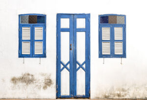 Blue wooden door and window on old white wall background