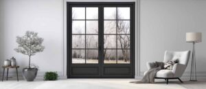 Bright trendy room with large window and dark door